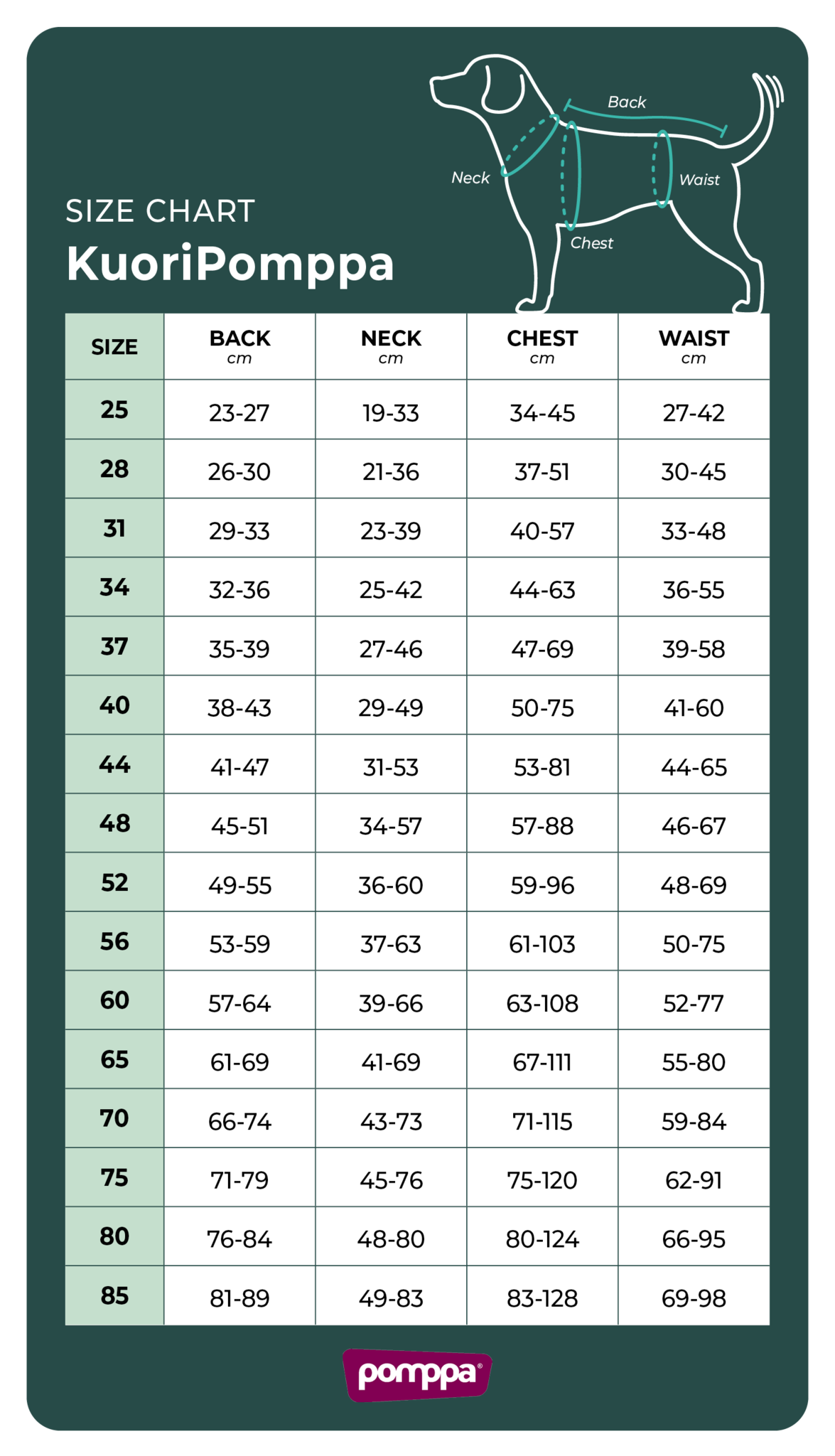 De maten van de Pomppa zijn gebaseerd op de ruglengte van de hond in centimeters. Kies de juiste maat voornamelijk op basis van de ruglengte van uw hond. De pasvorm van de KuoriPomppa is vergelijkbaar met die van de Sade-, Kevyt- en PerusPomppa, maar de verstelbare halslijn biedt meer bewegingsvrijheid bij het kiezen van de juiste maat. Als de afmetingen van uw hond tussen twee maten vallen, kies dan alleen de kleinere maat als uw hond zijn staart omhoog draagt.